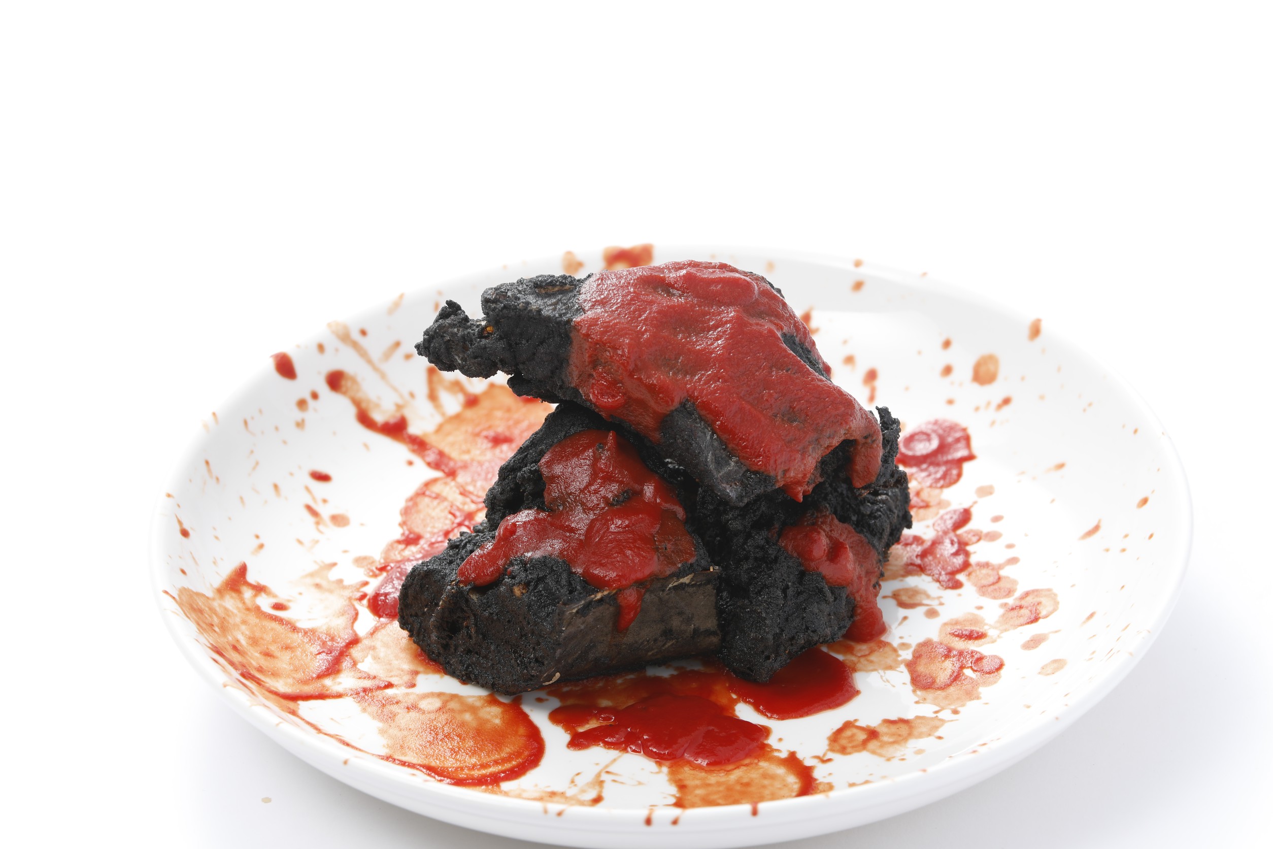 怪談色である赤と黒をモチーフにしたメニューで、マグロのカマをから揚げにし、上にはトマトソースをかけています。