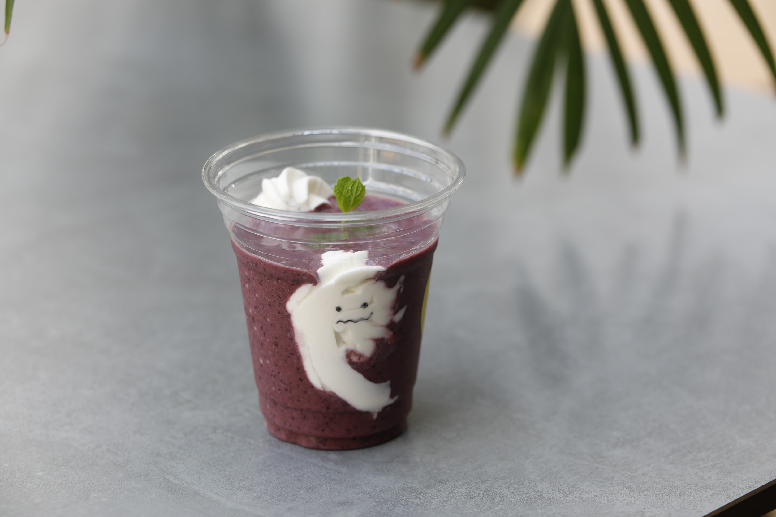 自家製のアサイードリンクにホイップクリームでおばけを可愛らしくトッピングしました。