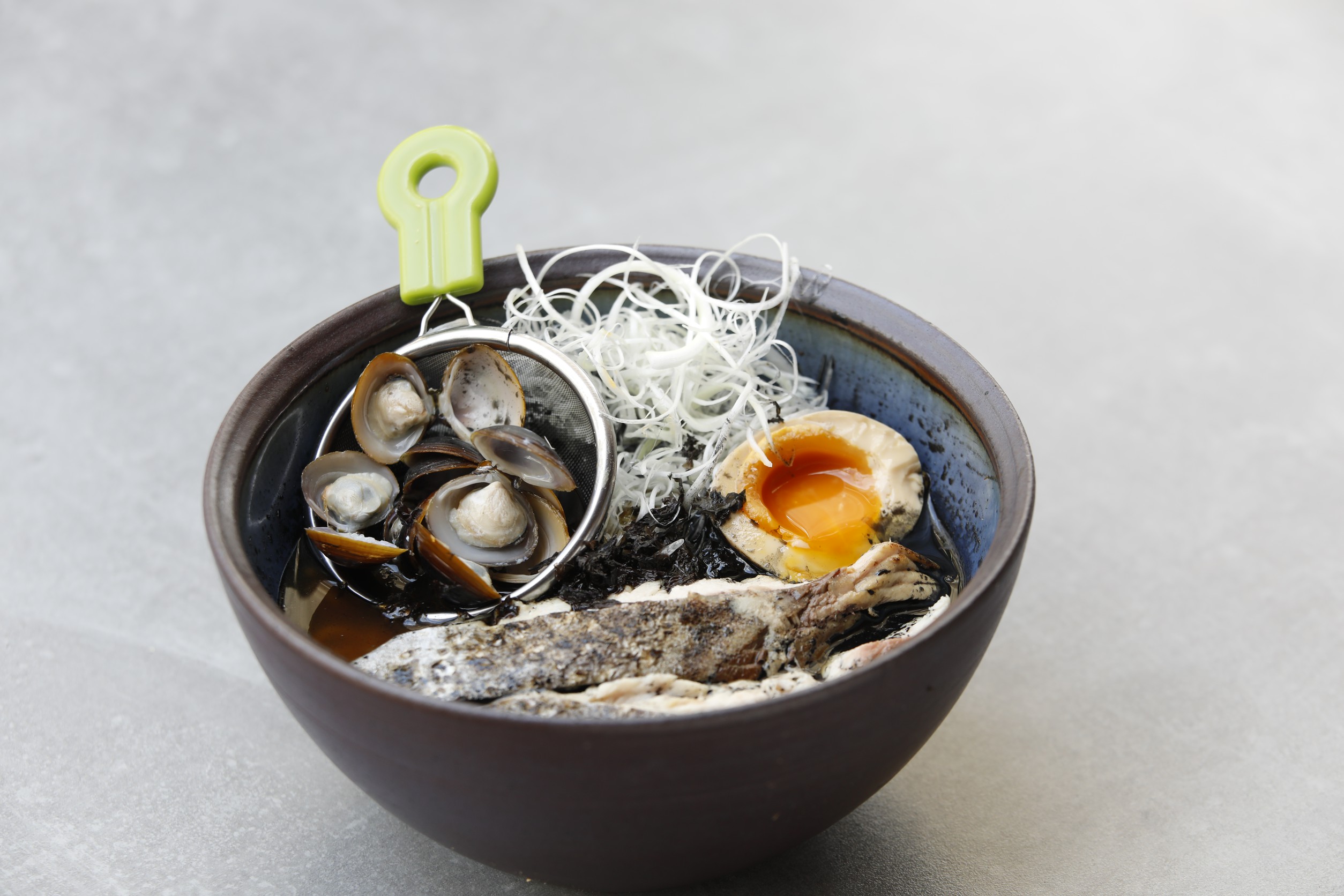 しじみとゆで卵は目をイメージし、白髪ねぎが紙、マグロのレアチャーシューで口をイメージしています。