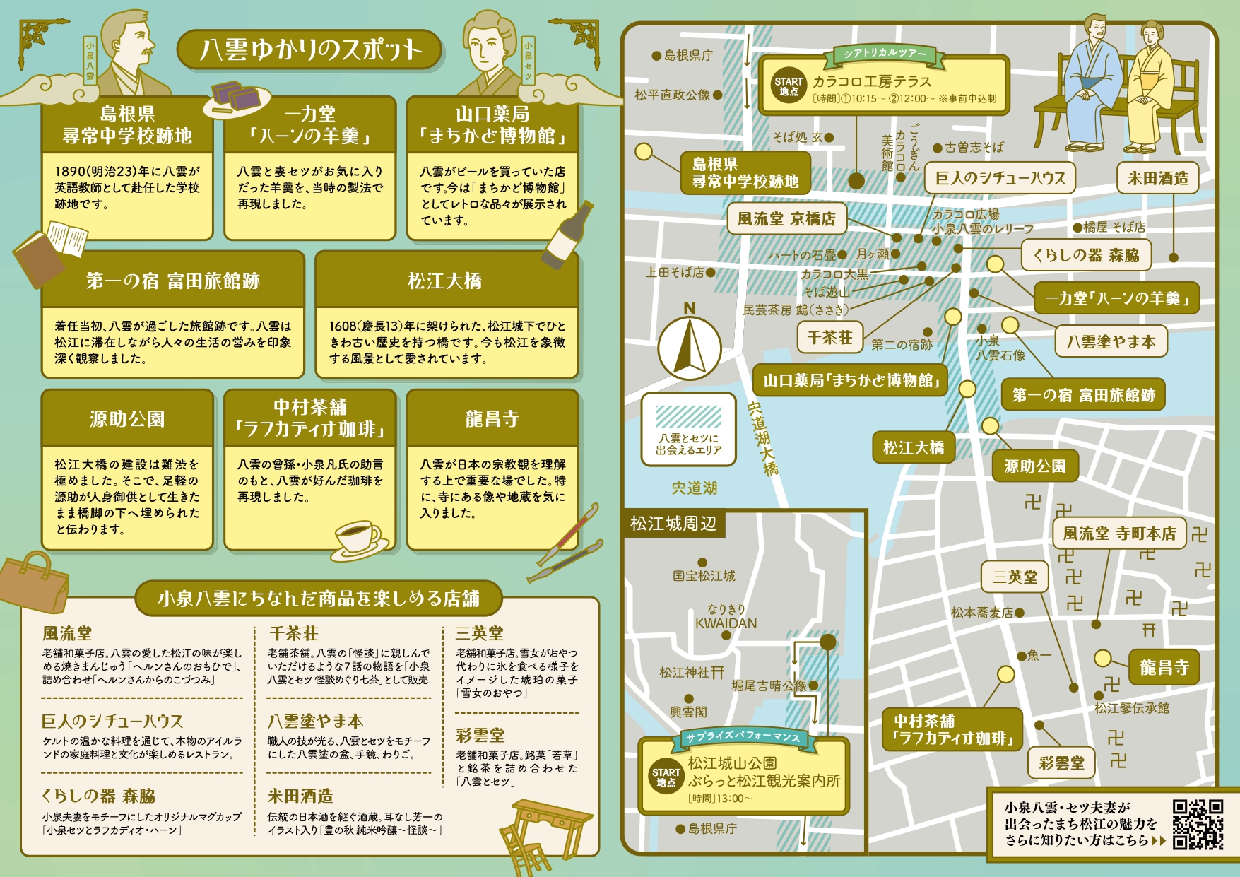 ※小泉八雲、セツがタイムトラベラーと共に、13時に出発地から松江中心部(地図上の「八雲とセツに出会えるエリア」)へと向かいます。
